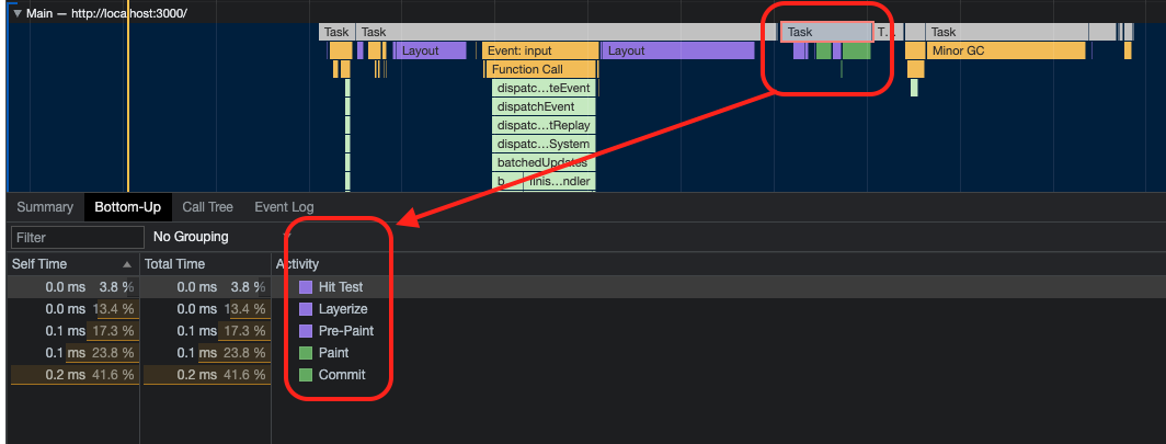 입력이벤트가 발생하고 Layout → Paint → Commit 과정을 통해 화면을 재조정하는것을 알 수 있다.