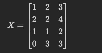 $$x_1 = [1, 2, 3], x_2 = [2, 2, 4], x_3 = [1, 1, 2], x_4 = [0, 3, 3]$$