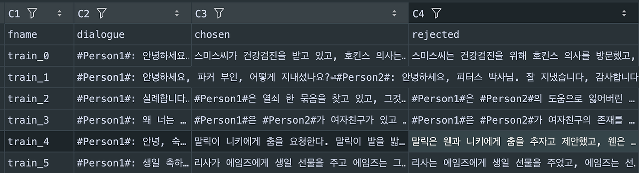 - 제공되는 데이터셋은 오직 "대화문과 요약문"