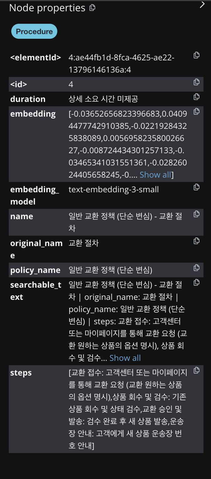 - 그래프 노드 정보를 벡터로 임베딩하여 유사도 기반 검색 구현